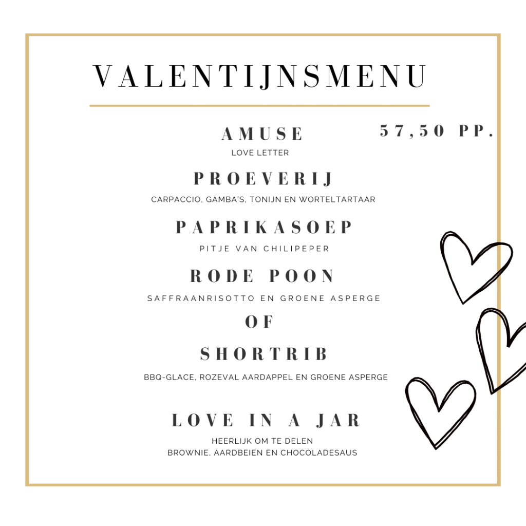 Laat je op 14 februari betoveren door een romantische avond aan het water. Speciaal voor Valentijnsdag hebben wij een verleidelijk menu samengesteld vol heerlijke smaken.
