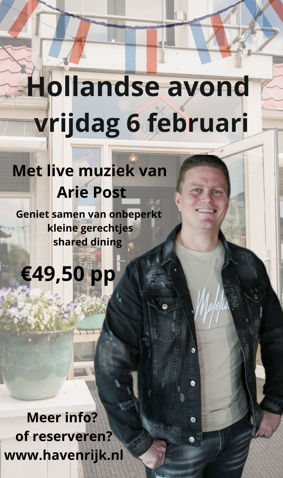 Tijdens de avond serveren wij onbeperkt heerlijke tapas gerechtjes en is er live muziek aanwezig van Arie Post.